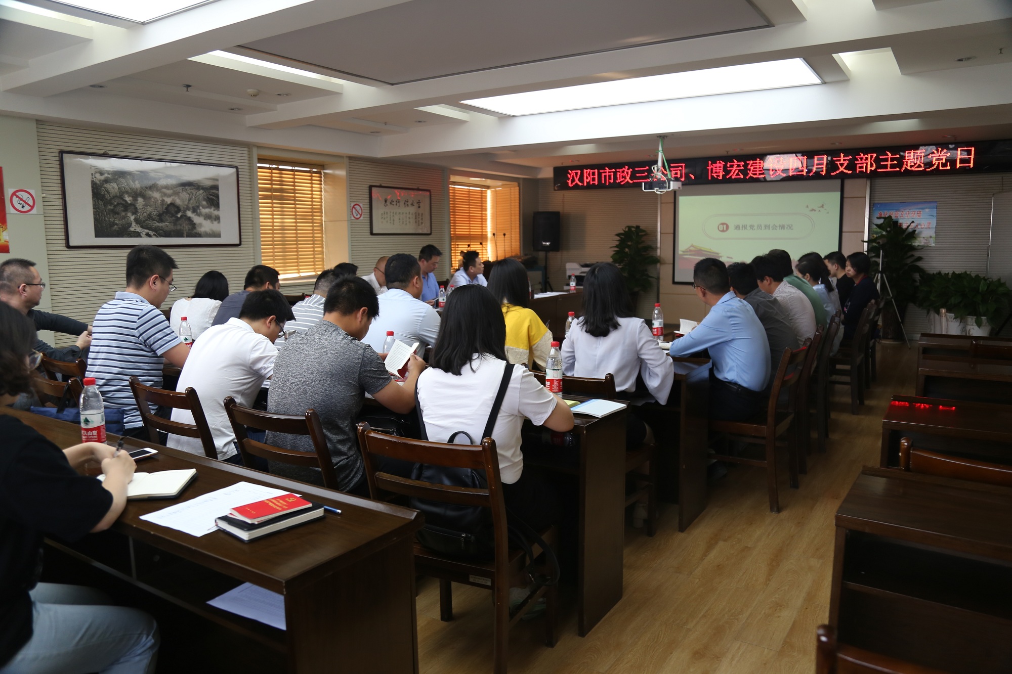 4月28日下午,漢陽市政三公司、博宏建設四月支部主題黨日活動在公司大會議室開展,活動以“深入學習兩會精神,感受榜樣風采”為主題,相比以往主題黨日活動,本次活動采用了線上對話方式,通過視頻對話設備使外地項目黨員也能全程參與到主會場的學習活動中來。